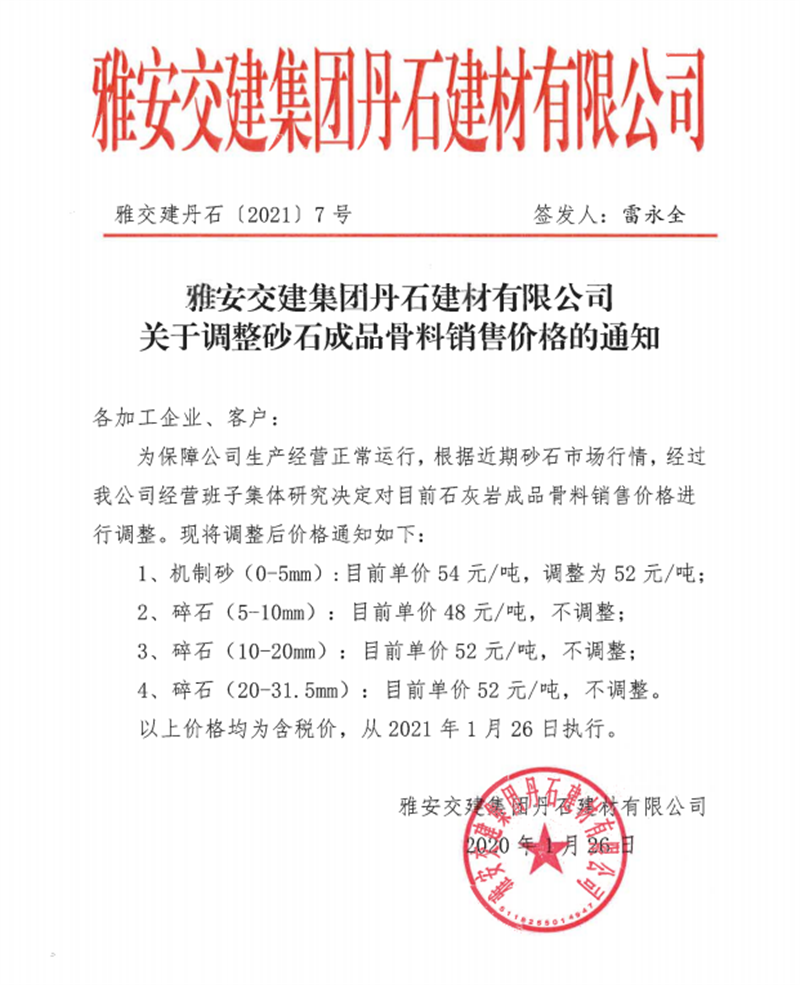 DB视讯 集团丹石公司石灰岩成品骨料挂牌价(2021.1.26)