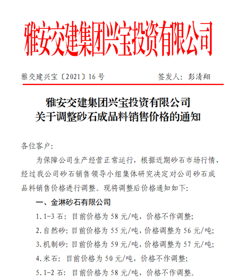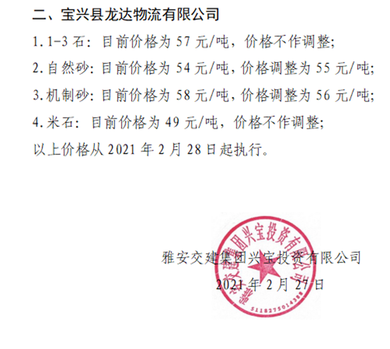 DB视讯 集团兴宝公司砂石骨料销售价格情况表(2021.2.28)
