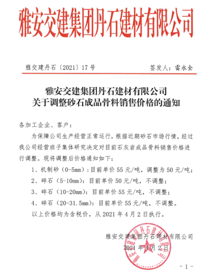 雅安市交建集团丹石公司石灰岩成品骨料挂牌价(2021.4.2)
