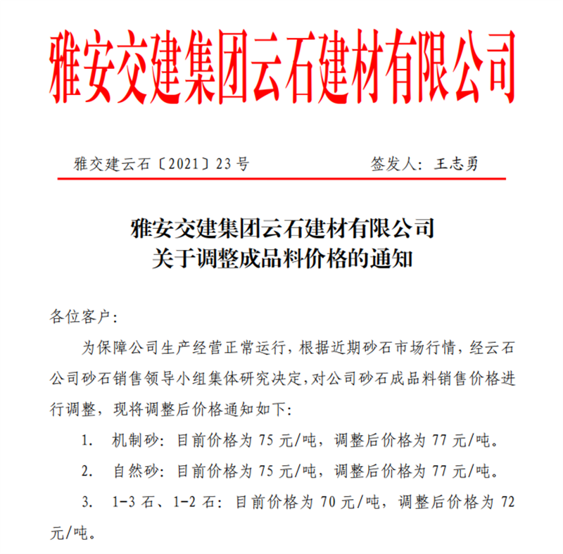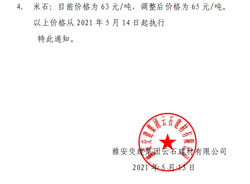 DB视讯 集团云石公司砂石骨料销售价格情况表(2021.5.14)