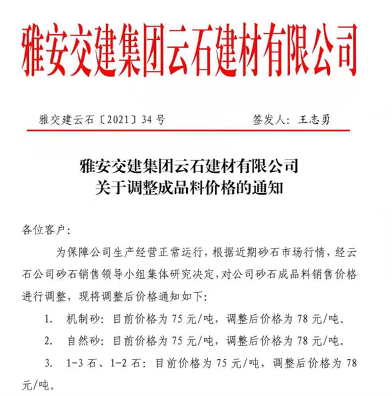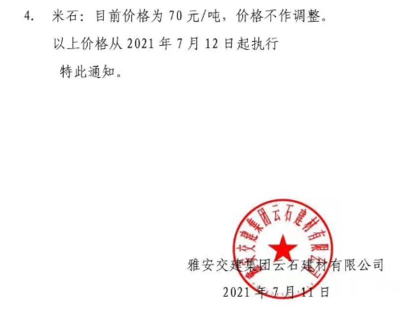 DB视讯 集团云石公司砂石骨料销售价格情况表(2021.7.12)