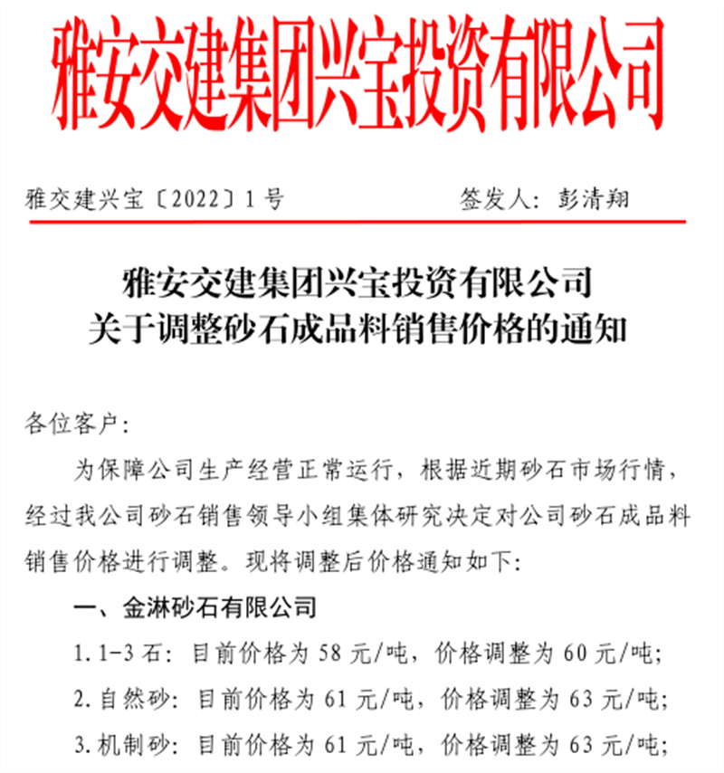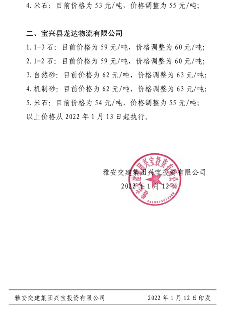 DB视讯 集团丹石公司关于调整砂石成品骨料销售价格的通知(2022.1.5)