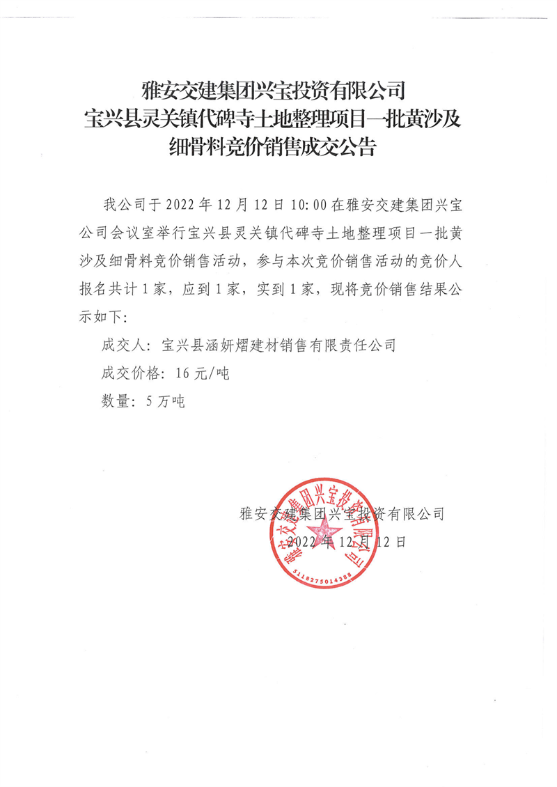 DB视讯 集团兴宝投资有限公司宝兴县灵关镇代碑寺土地整理项目5万吨黄沙及细骨料竞价销售成交公告(2022-12-12)