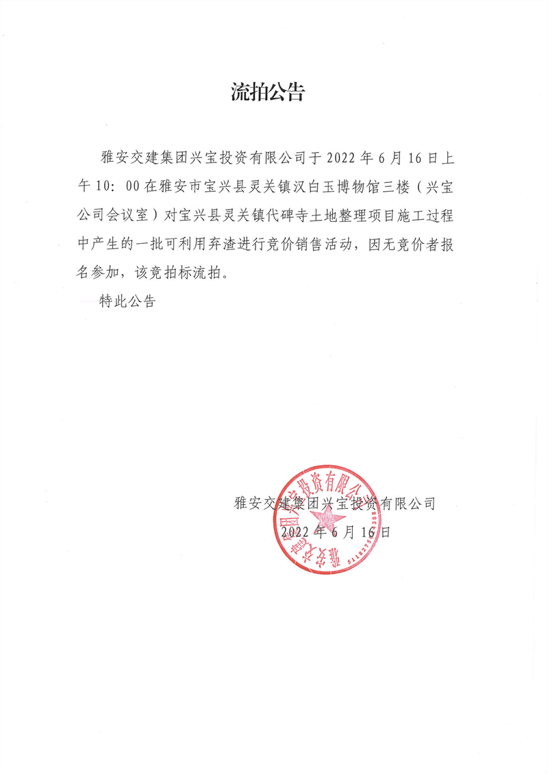 DB视讯 集团兴宝投资有限公司宝兴县灵关镇代碑寺土地整理项目-批可利用 弃渣第二次竞价销售公告( 2022.6.16 )