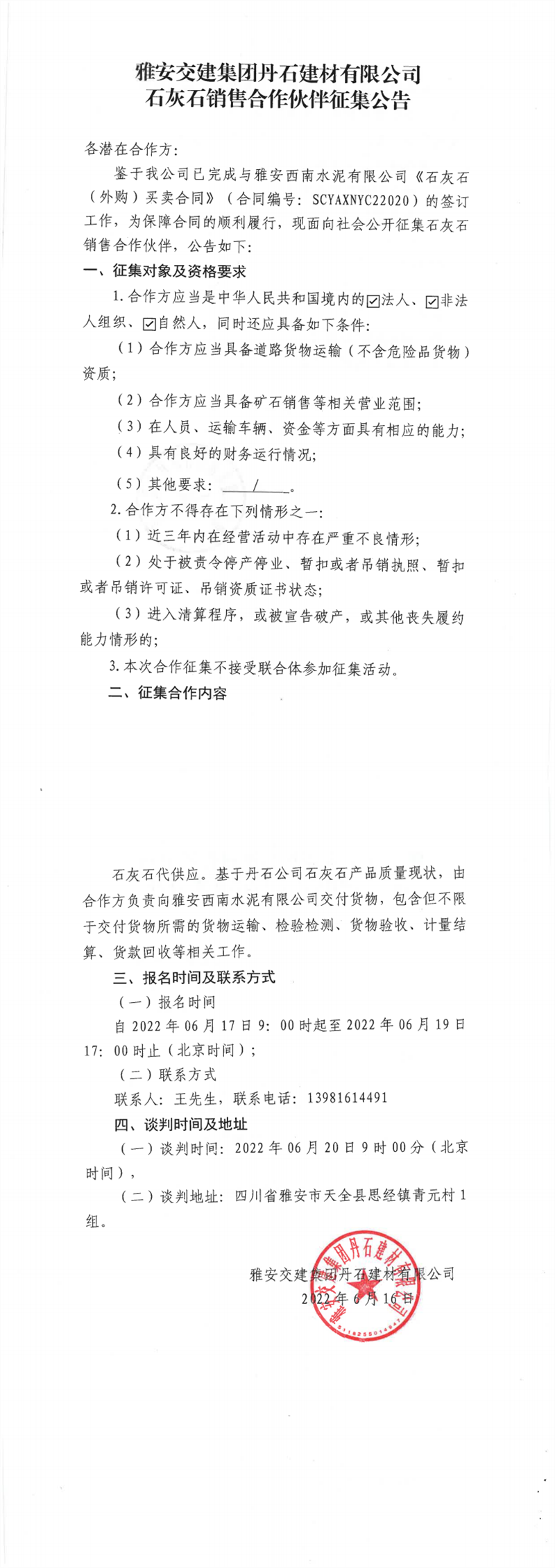 DB视讯 集团丹石建材有限公司石灰石销售合作伙伴征集公告6-16