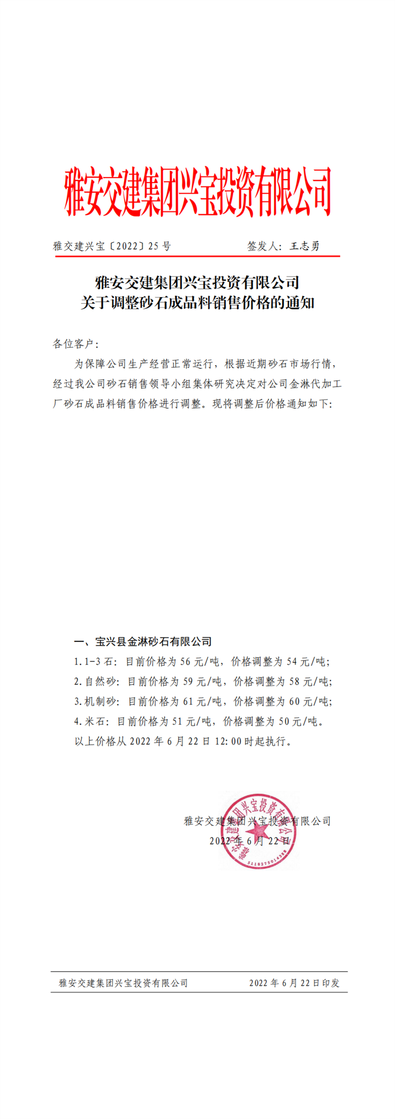 DB视讯 集团兴宝投资有限公司 关于调整砂石成品料销售价格的通知(2022-6-22)