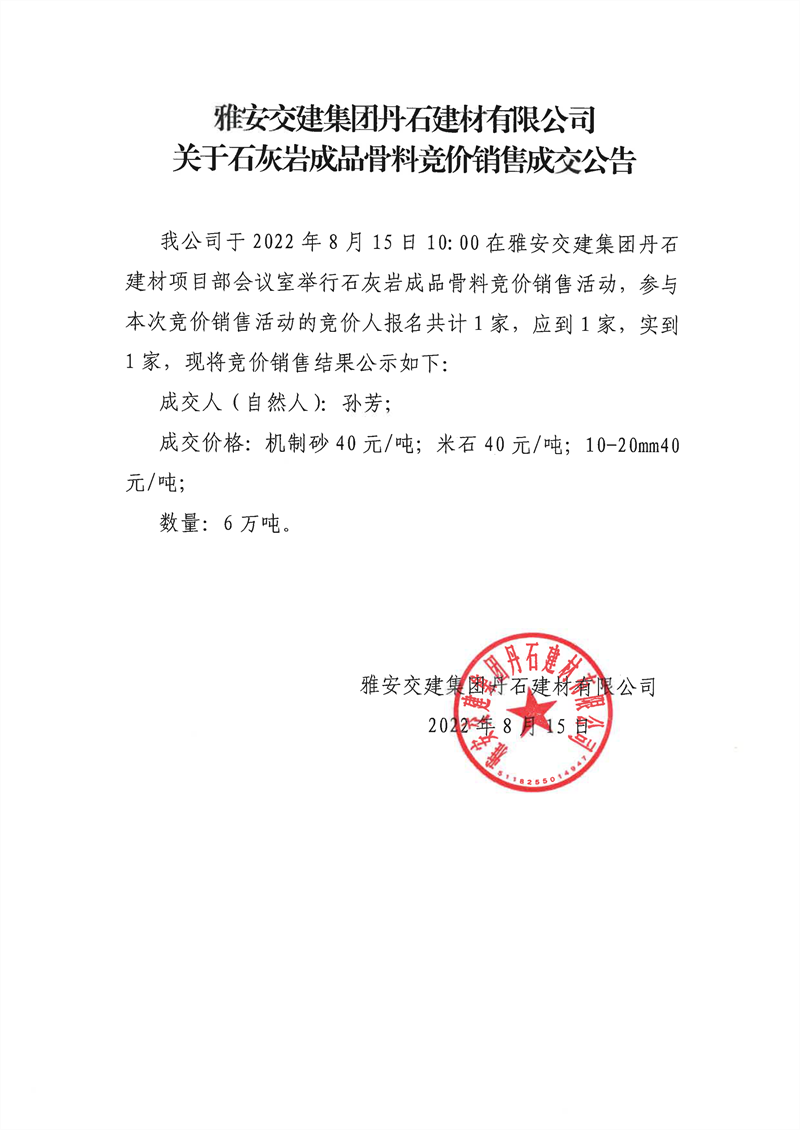 DB视讯 集团丹石建材有限公司关于石灰岩成品骨料竞价销售成交公告