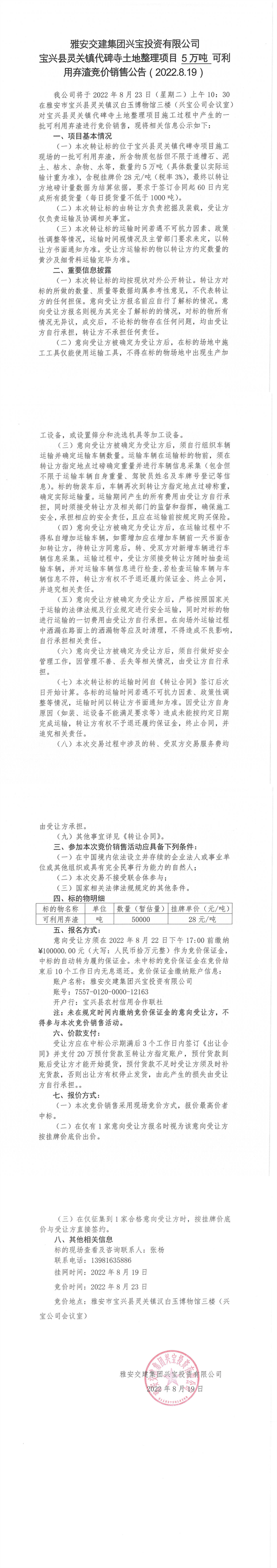DB视讯 集团兴宝投资有限公司灵关镇代碑寺土地整理项目5万吨可利用弃渣竞价销售公告(2022.8.19)(1)