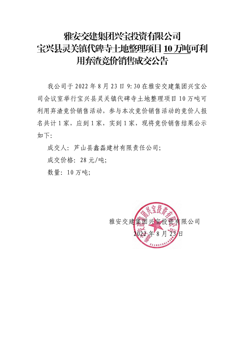 DB视讯 集团兴宝投资有限公司宝兴县灵关镇代碑寺土地整理项目5万吨可利用弃渣竞价销售成交公告(8.23)