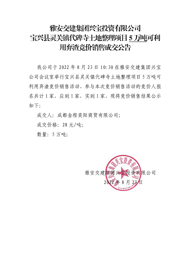 DB视讯 集团兴宝投资有限公司宝兴县灵关镇代碑寺土地整理项目10万吨可利用弃渣竞价销售成交公告(8.23)