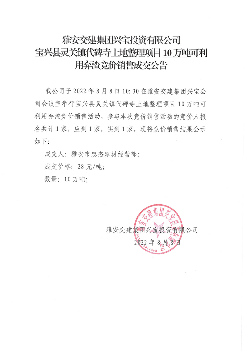 代碑寺土地整理项目10万吨可利用弃渣竞价销售成交公告