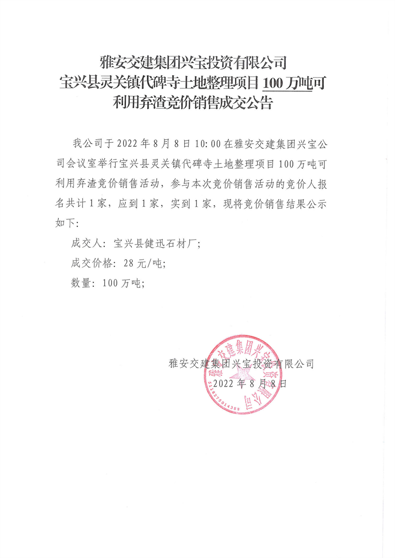 代碑寺土地整理项目10万吨可利用弃渣竞价销售成交公告