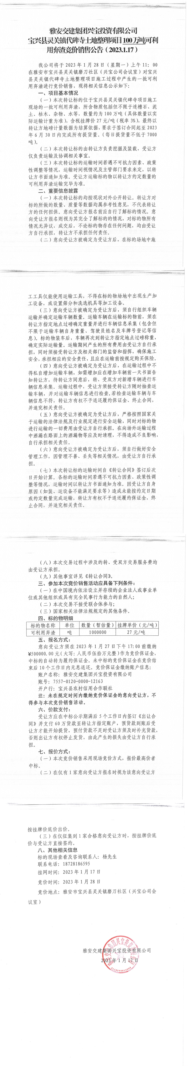 DB视讯 集团兴宝投资有限公司灵关镇代碑寺土地整理项目100万吨可利用弃渣竞价销售公告(2023.1.17)