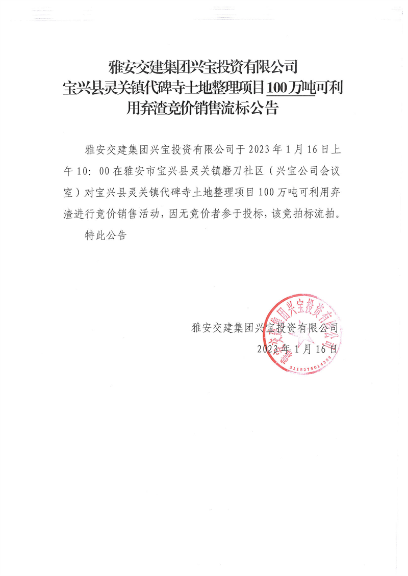 DB视讯 集团兴宝投资有限公司100万吨可利用弃渣竞价销售流标公告(2023.1.16)