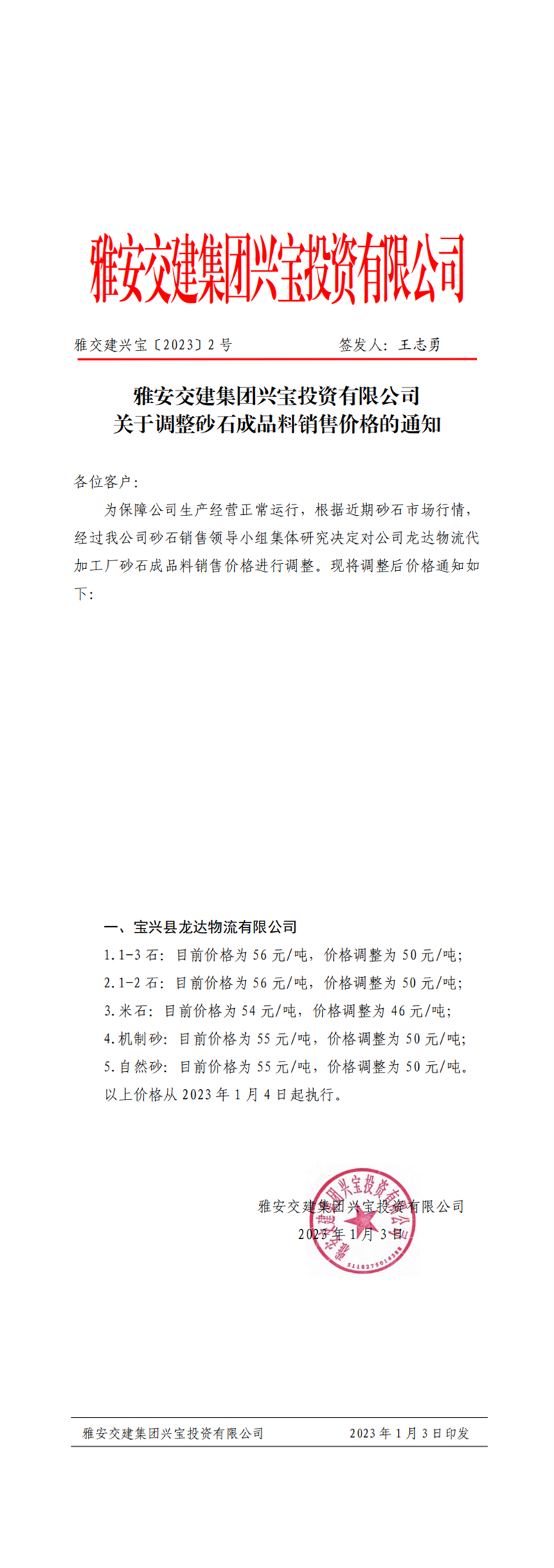 雅交建兴宝〔2023〕2号 关于调整砂石成品料销售价格的通知-2023-01-03