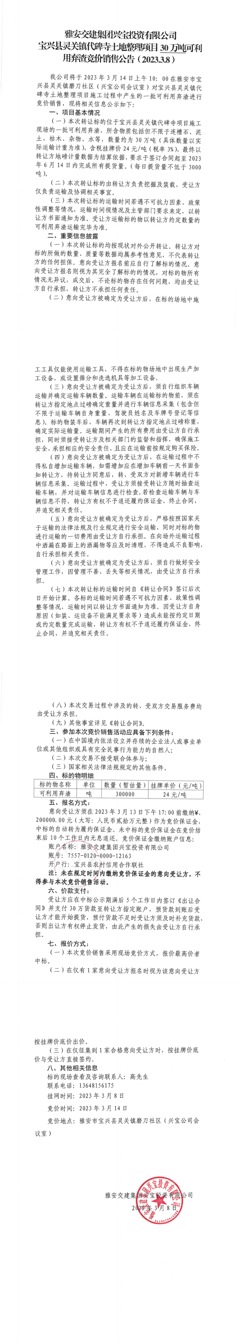 DB视讯 集团兴宝投资有限公司灵关镇代碑寺土地整理项目30万吨可利用弃渣竞价销售公告(2023.3.8)