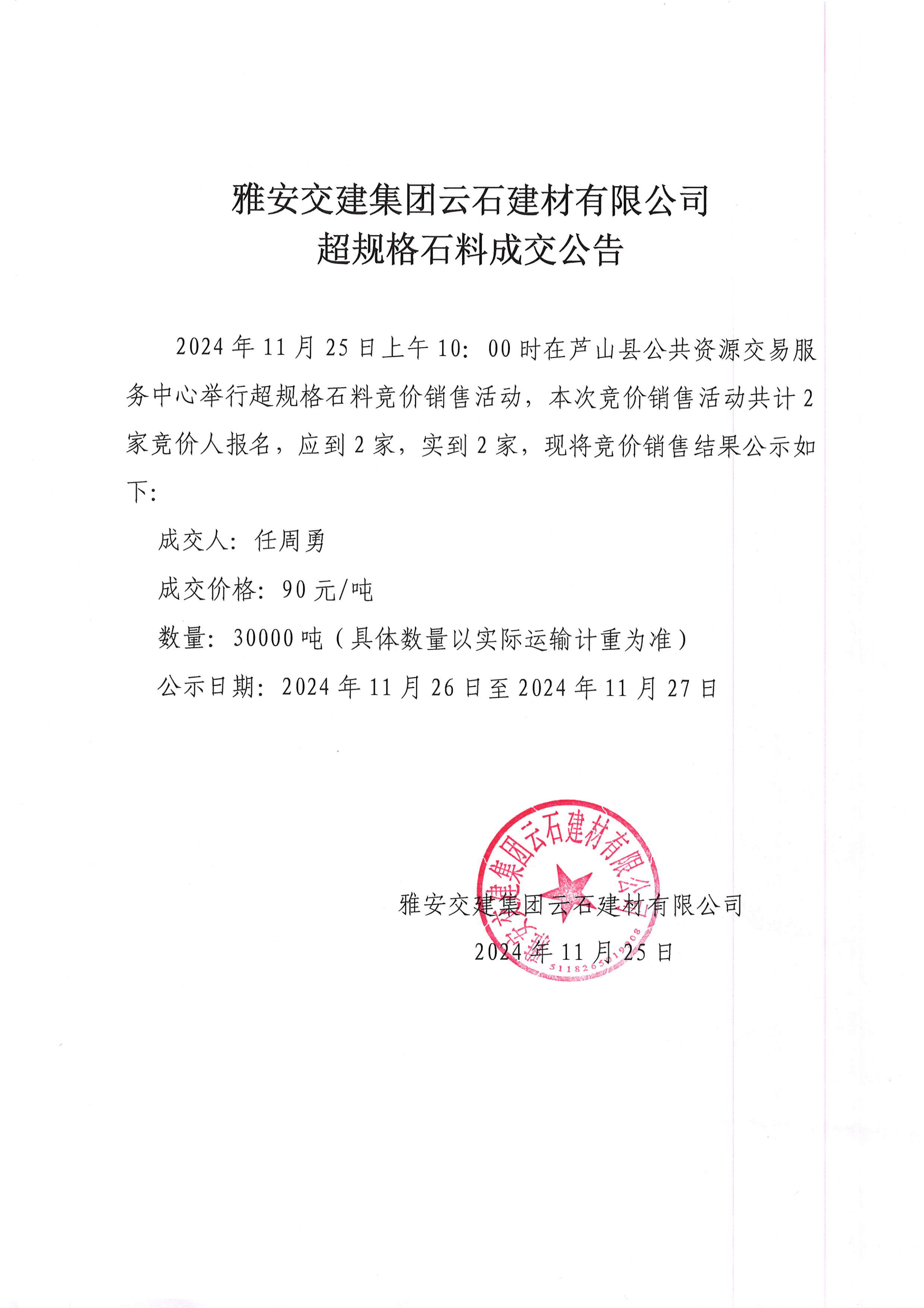 DB视讯 集团云石建材有限公司超规格石料竞价销售成交公告(2024-11-26)