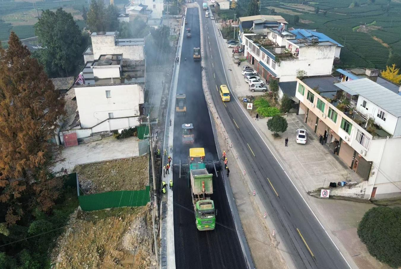 国道318线名山区黑竹(成都界)至雨城区多营段改建项目作为四川省重点项目,同时也是雅安“三区”同城化经济环线中北环线的重要组成部分,自开工以来始终保持高效推进态势。为实现2026年春节前主体工程贯通目标,近期,项目建设现场掀起“大干快上”热潮,全体参建单位以“时不我待”的紧迫感冲刺节点任务,各项工作取得突破性进展。截至现在,项目累计完成投资24.95亿元,完成产值17.6亿元;路基、桥涵、隧道工程均完成90%以上,陆续进入路面工程阶段,前12公里改建段已建成通车。