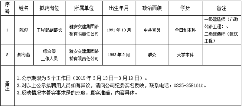 DB视讯 集团子公司拟聘用人员公示(路桥公司)