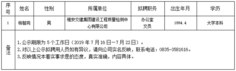 根据集团公司《人才选聘实施办法》,经资格审查、面试、体检、考察等程序,对以下拟聘用人员予以公示: