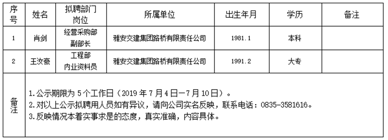 DB视讯 集团子公司拟聘用人员公示(路桥公司)