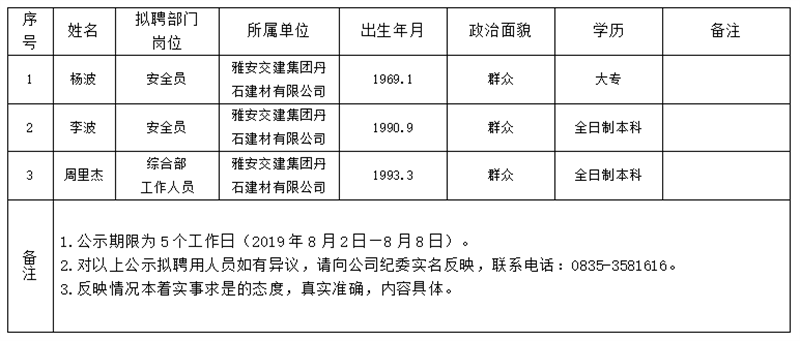 DB视讯 集团子公司拟聘用人员公示(丹石建材公司)