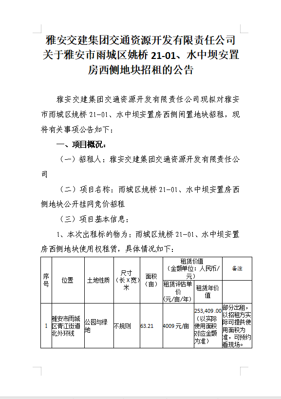 DB视讯 集团交通资源开发有限责任公司关于雅安市雨城区姚桥21-01、水中坝安置房西侧地块招租的公告