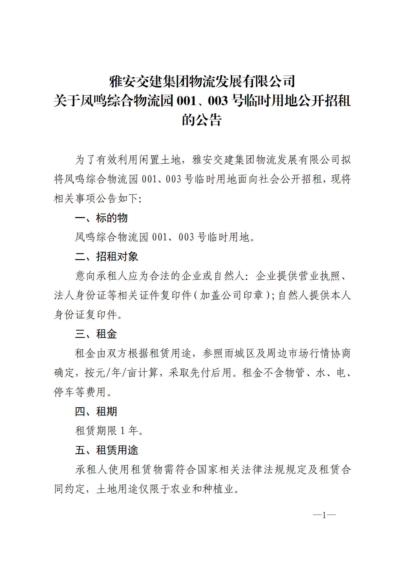 DB视讯 集团物流开展有限公司 关于凤鸣综合物流园001、003号临时用地公开招租的公告