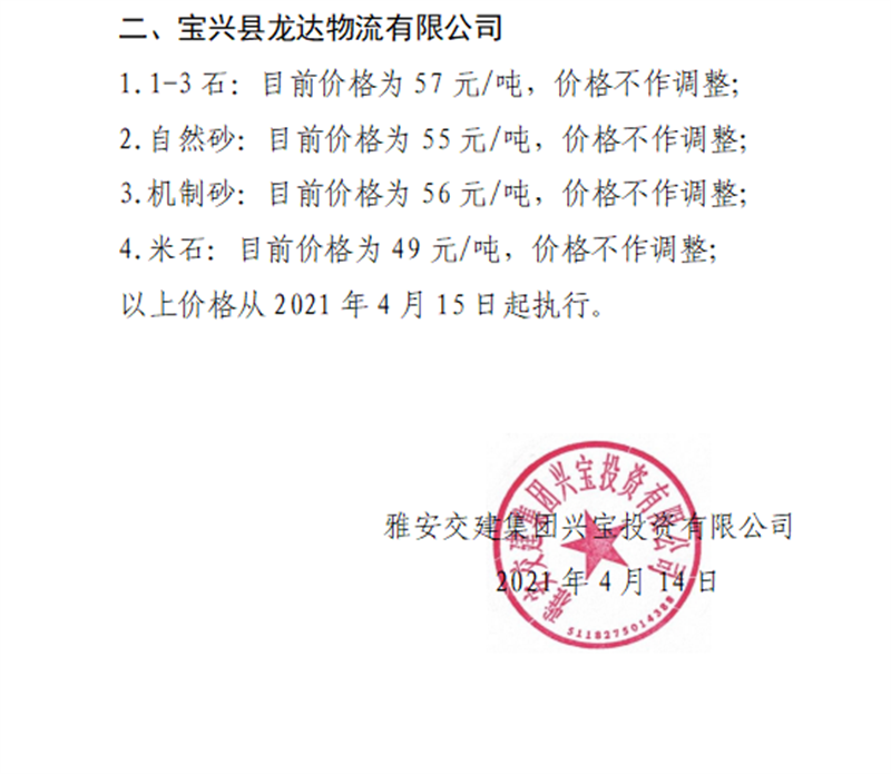 DB视讯 集团兴宝公司砂石骨料销售价格情况表(2021.4.15)